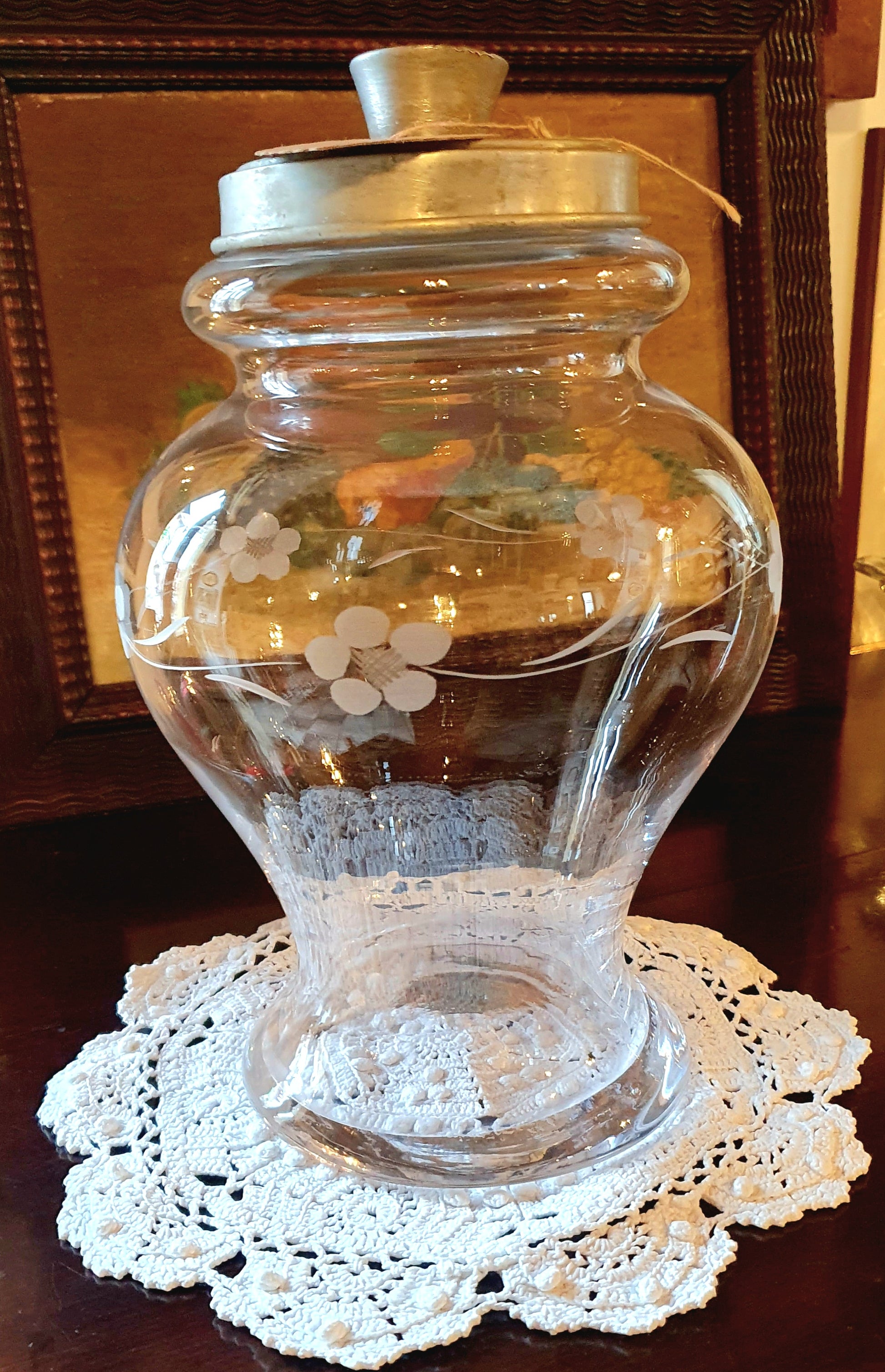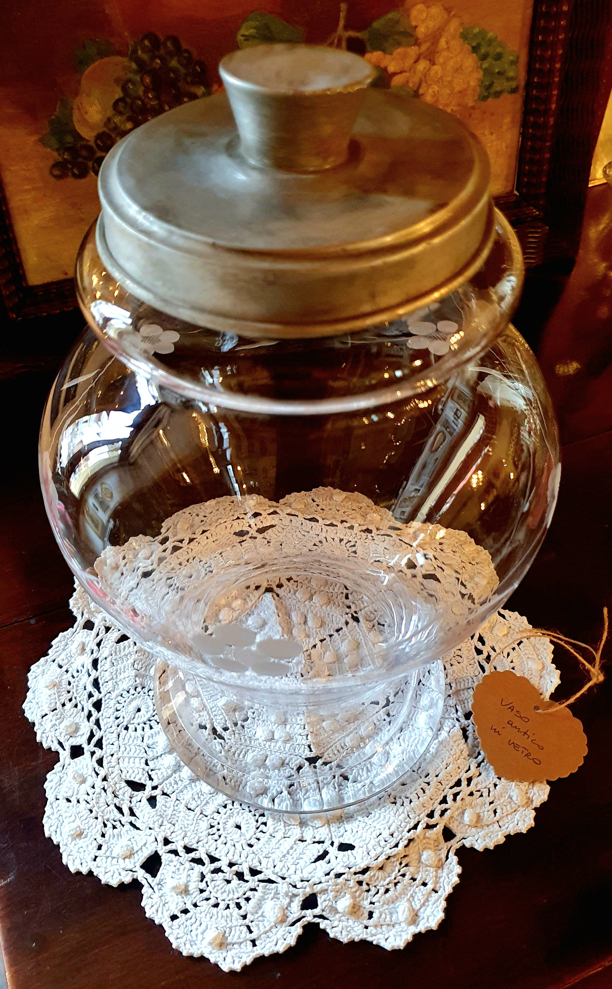 Antico vaso in vetro serigrafato con tappo in alluminio.