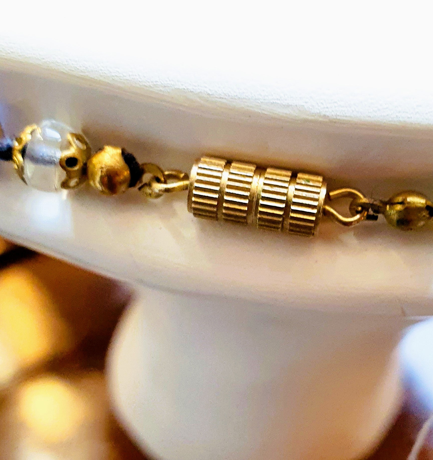 Perle in vetro trasparente, blu sommerso e oro.