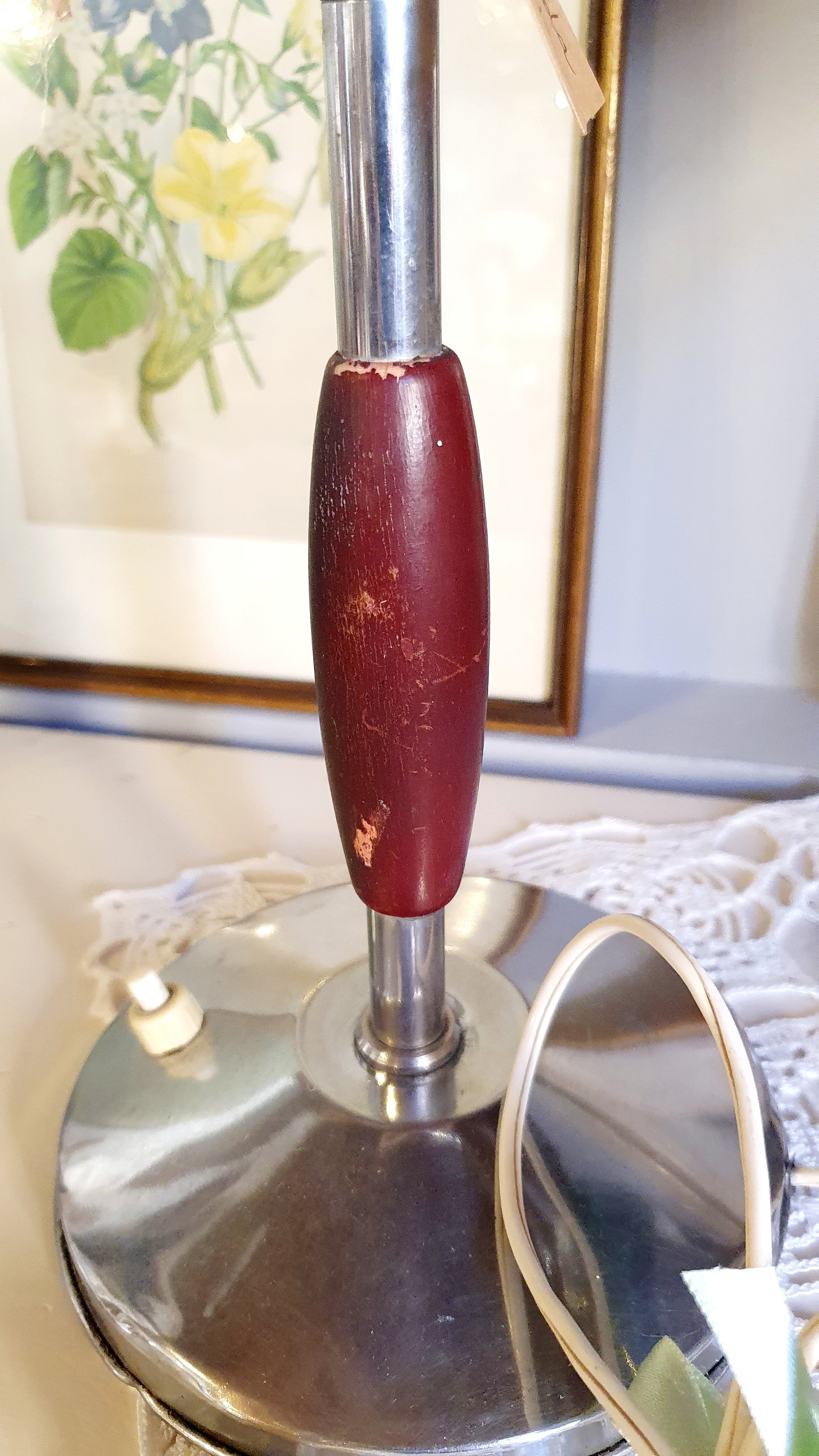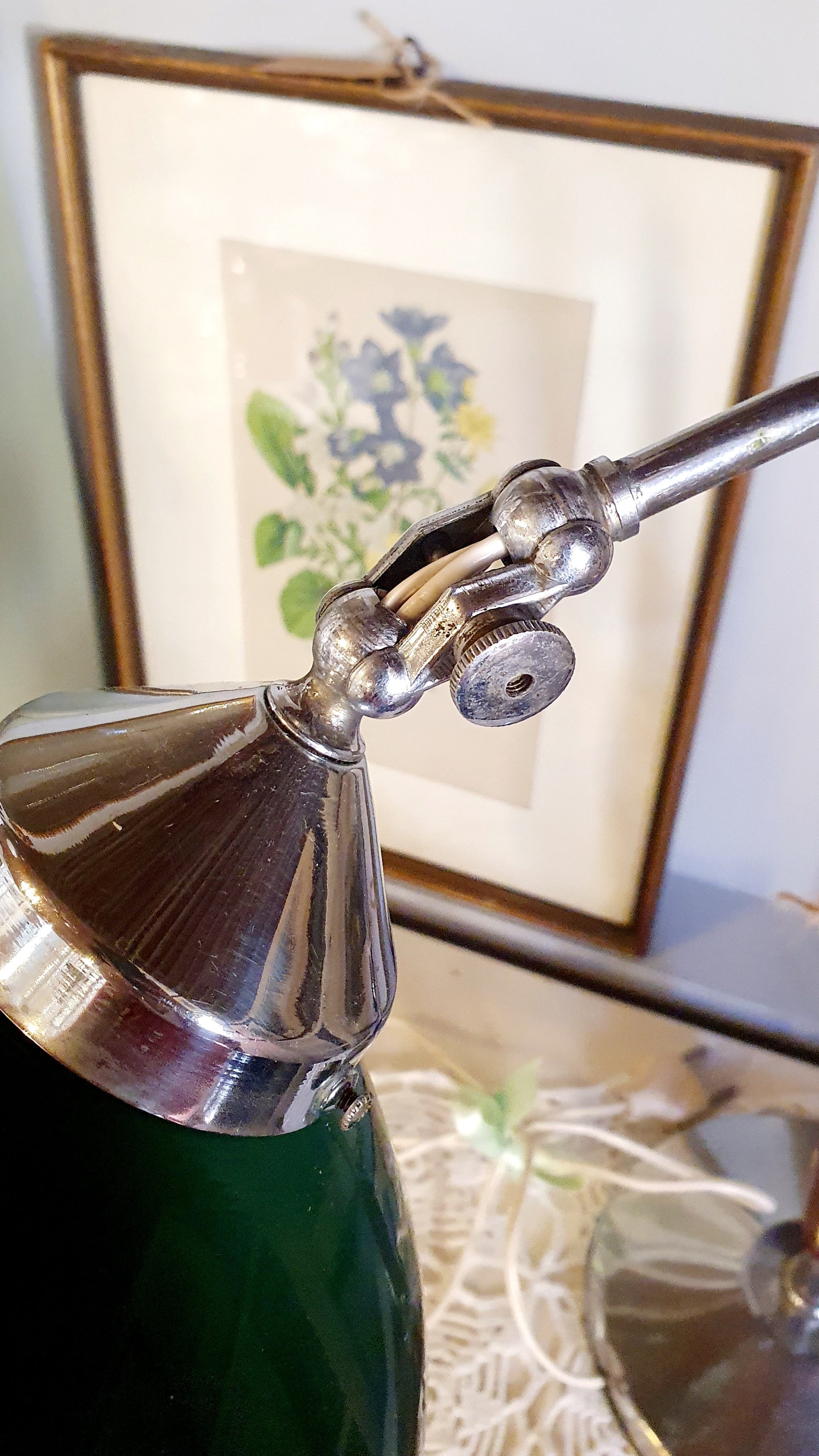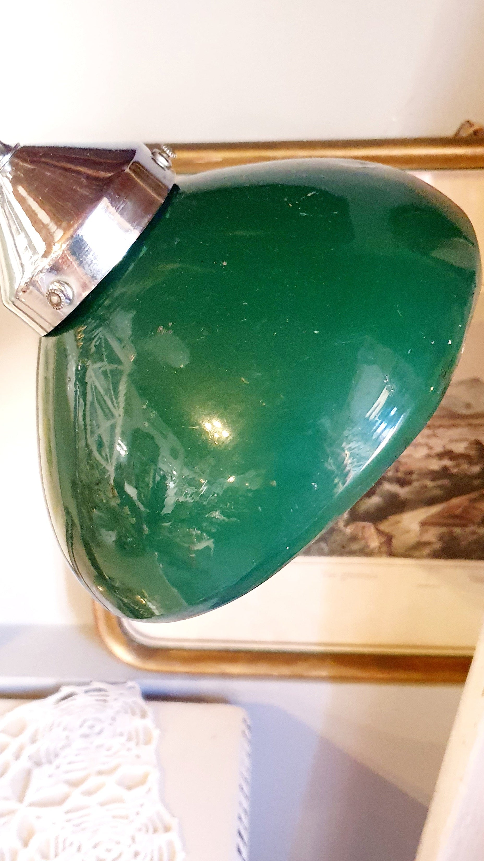 Lampada da scrivania in metallo cromato, legno e paralume verde.