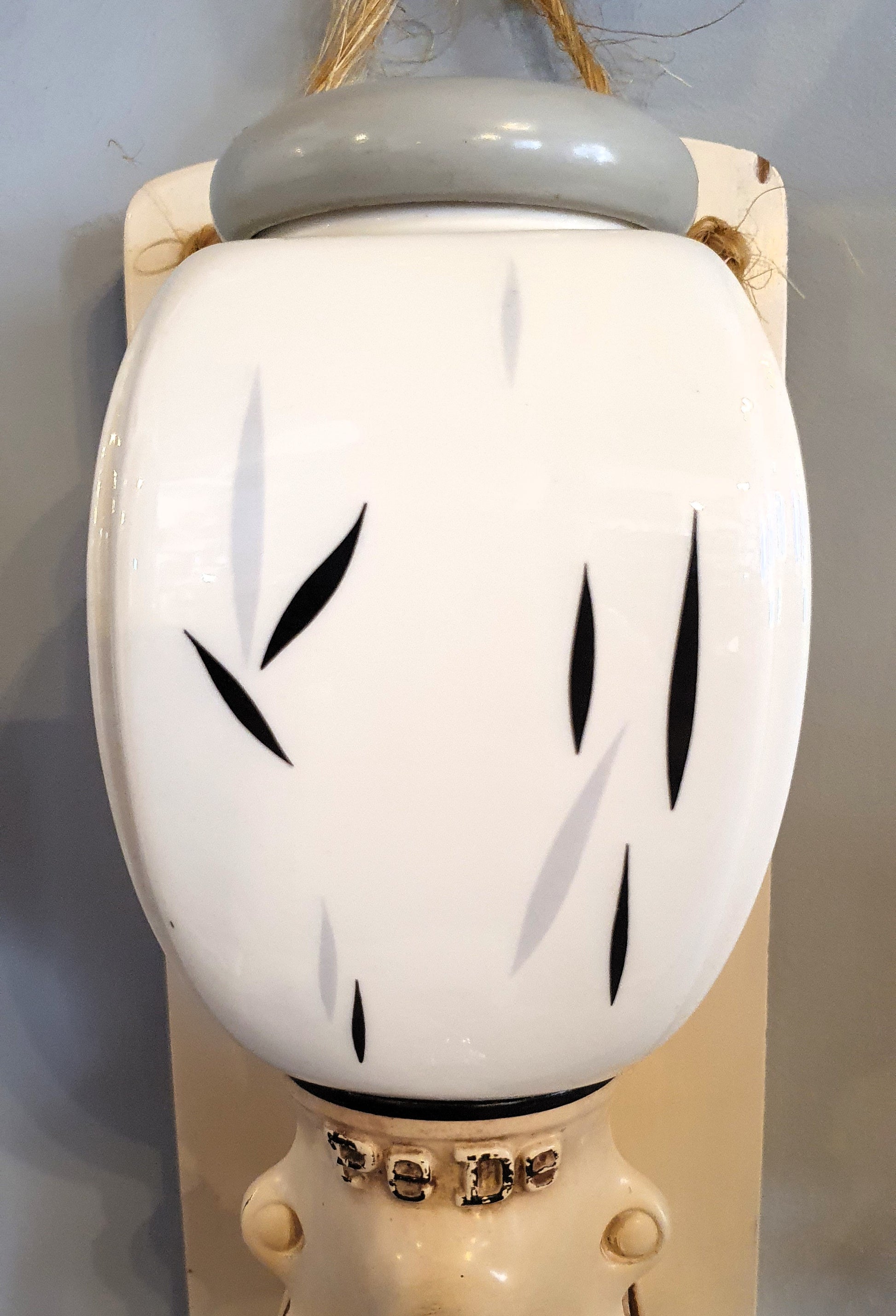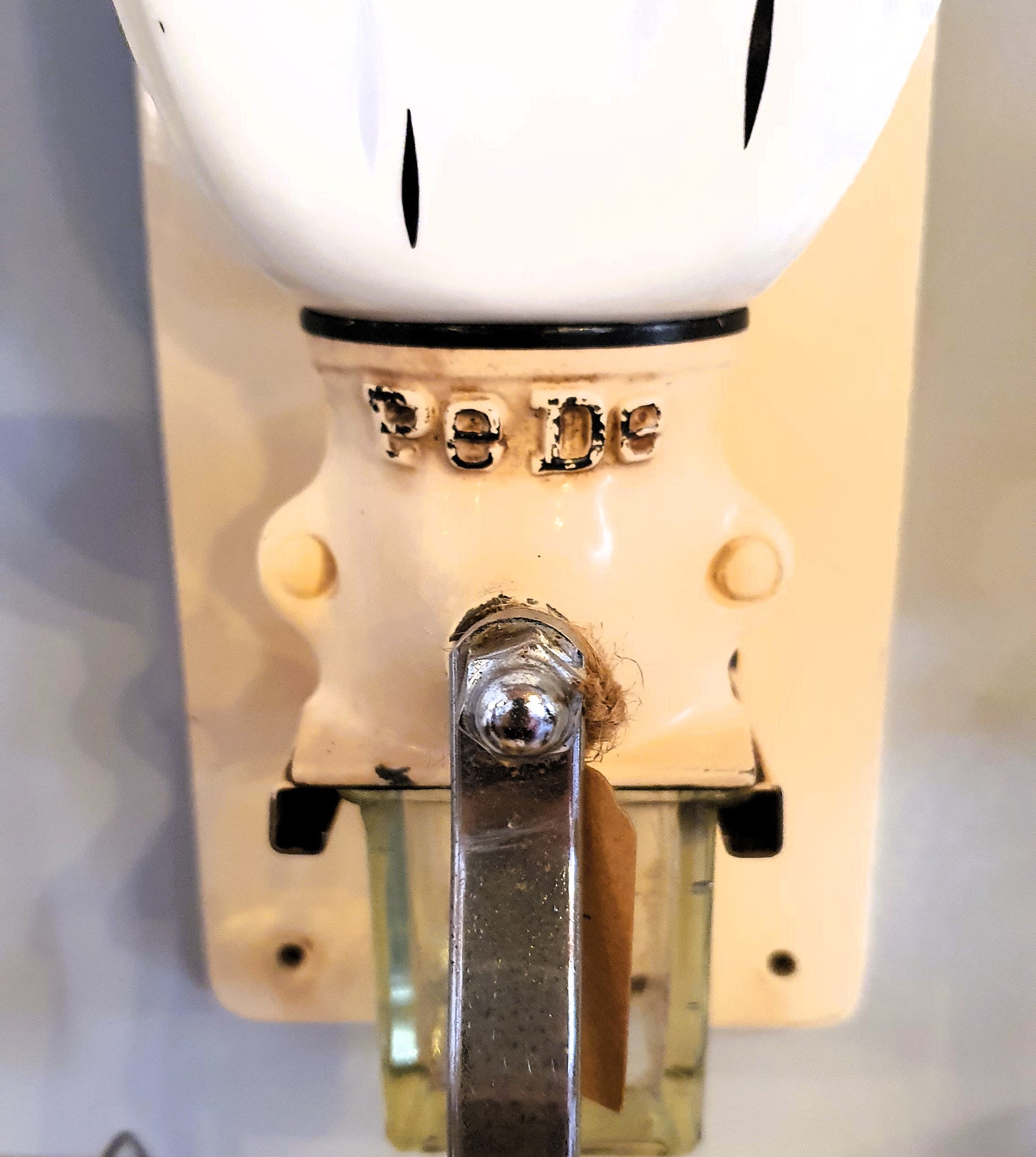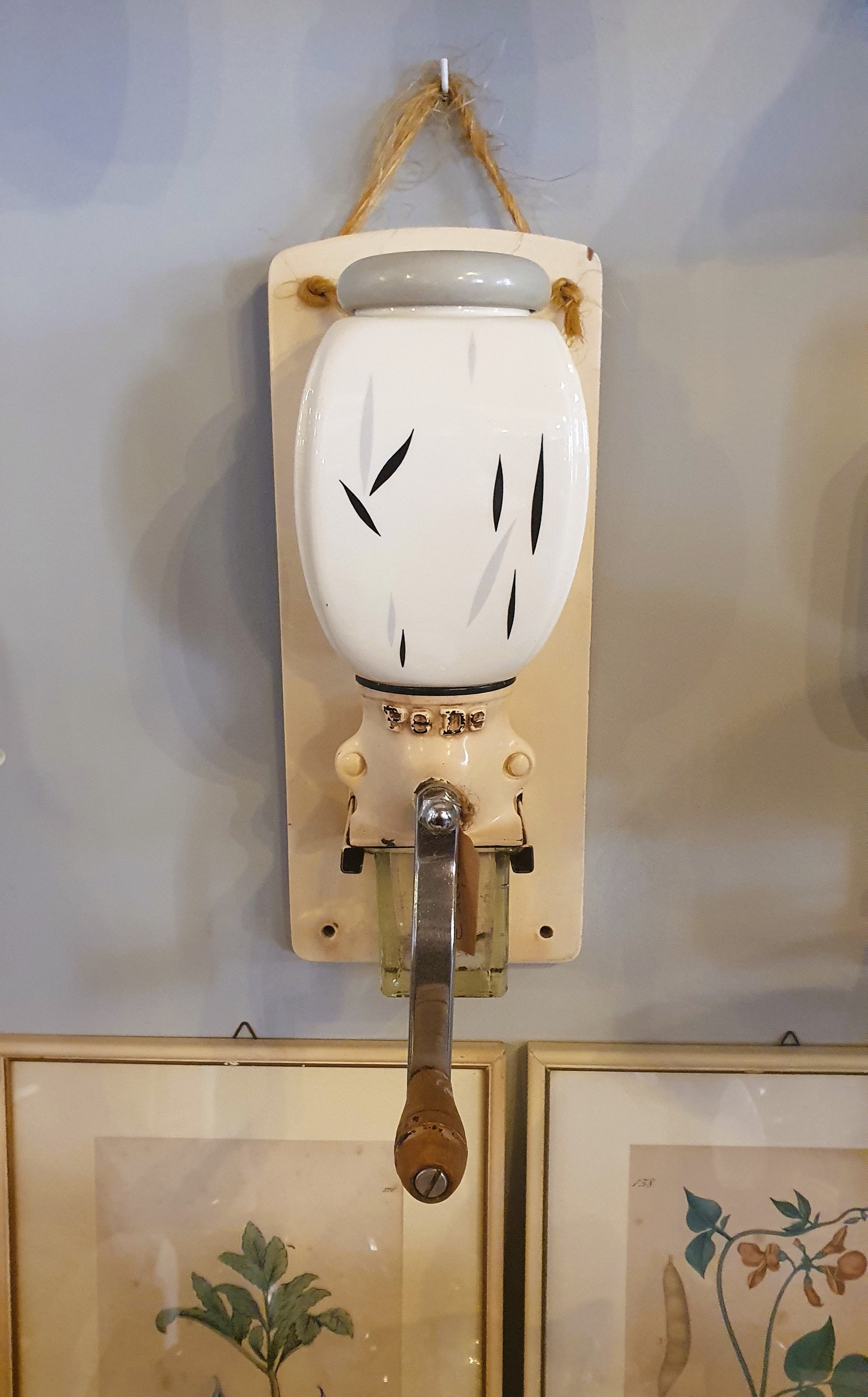 Macinacaffè da muro in ceramica e ghisa, con supporto in legno e bicchiere in vetro.