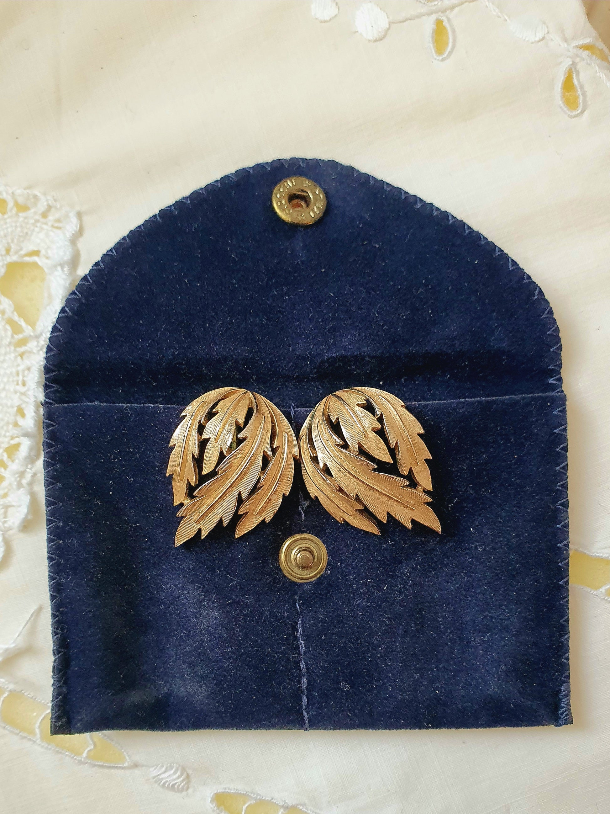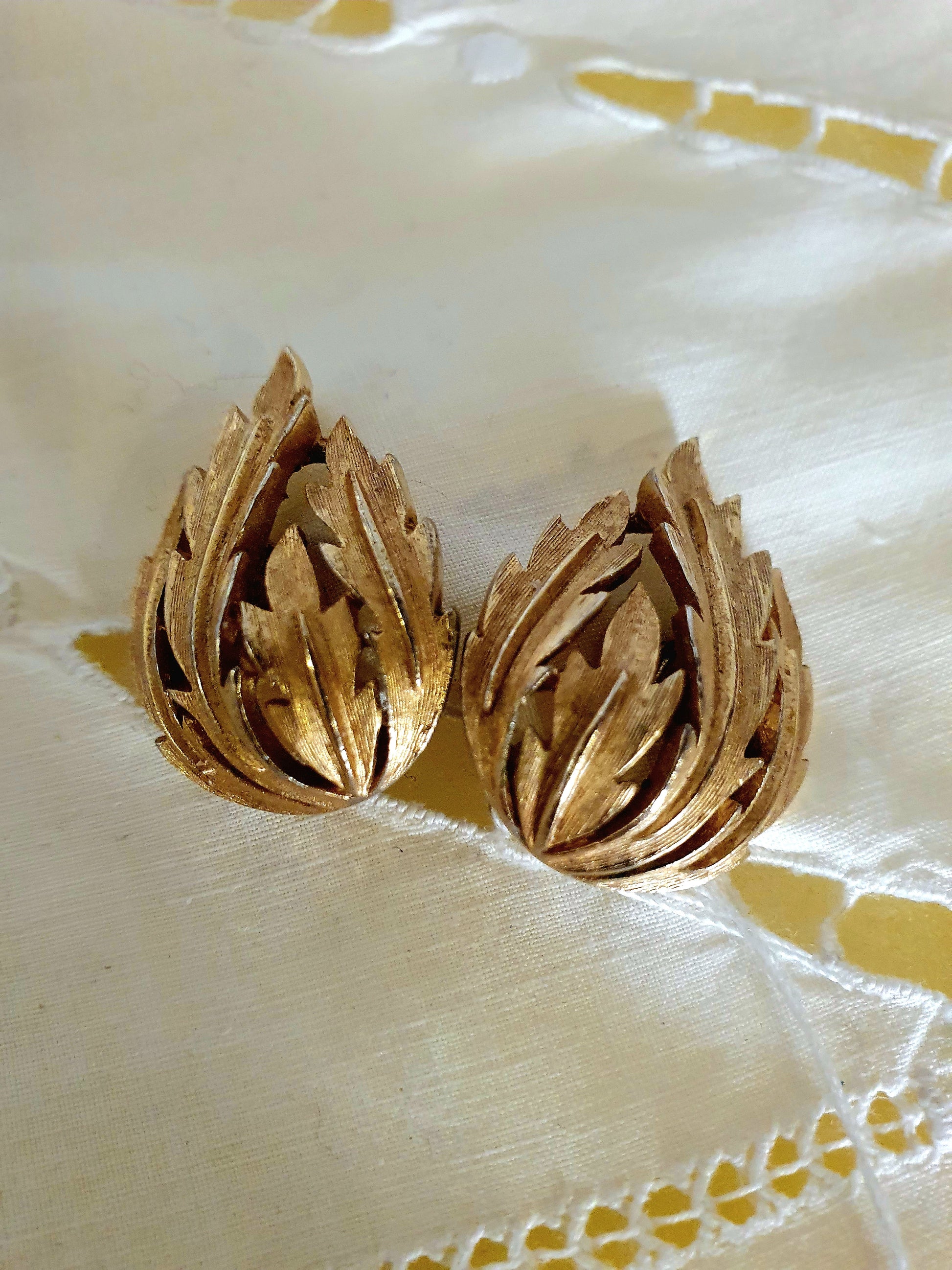 Orecchini di bigiotteria americana con foglie in lega dorata spazzolata, a clip.