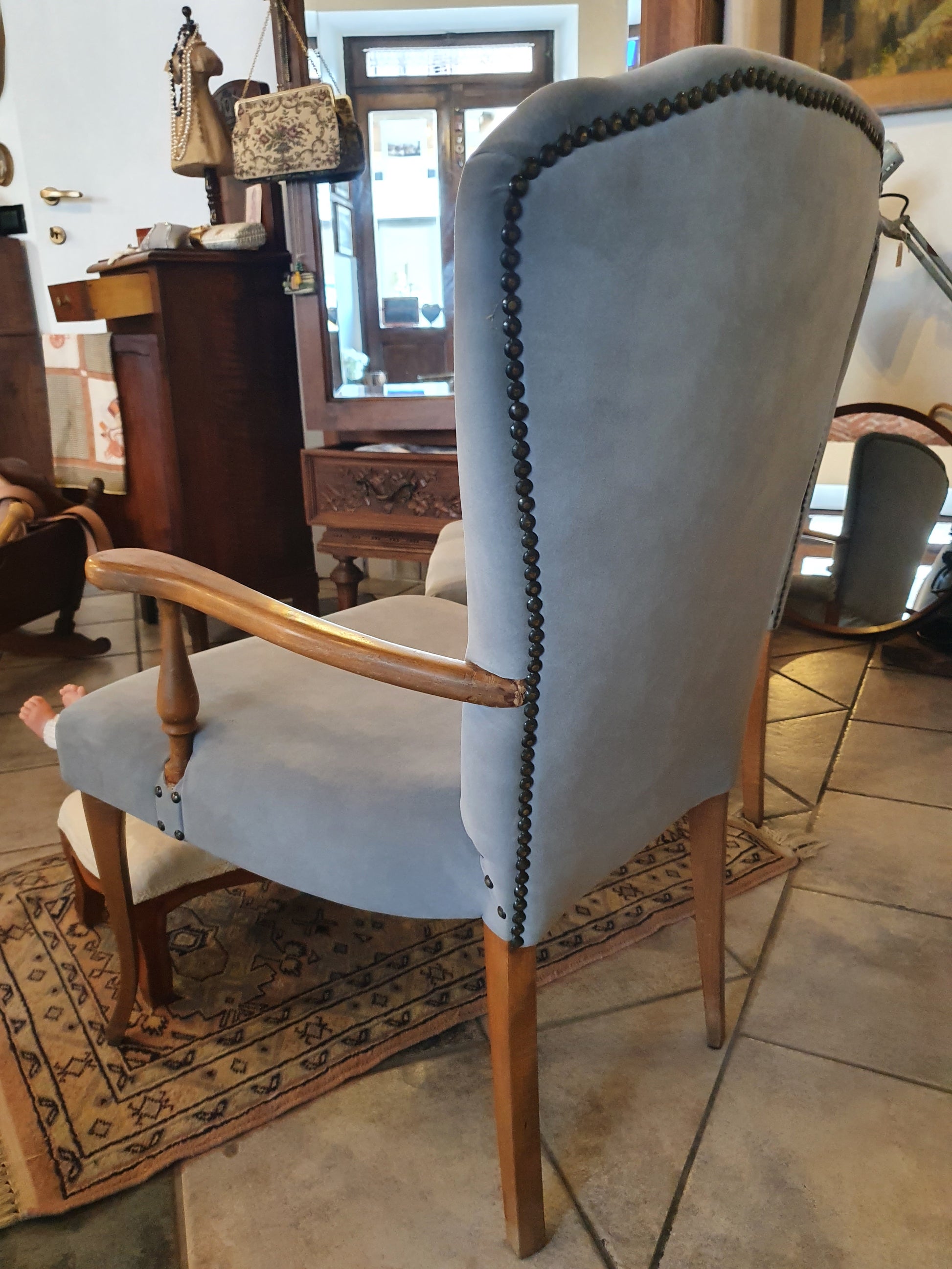 Rivestimento in velluto carta da zucchero e imbottitura, allo stato originale. Gambe e braccioli in tinta miele e legno massello. Alcuni segni del tempo.
