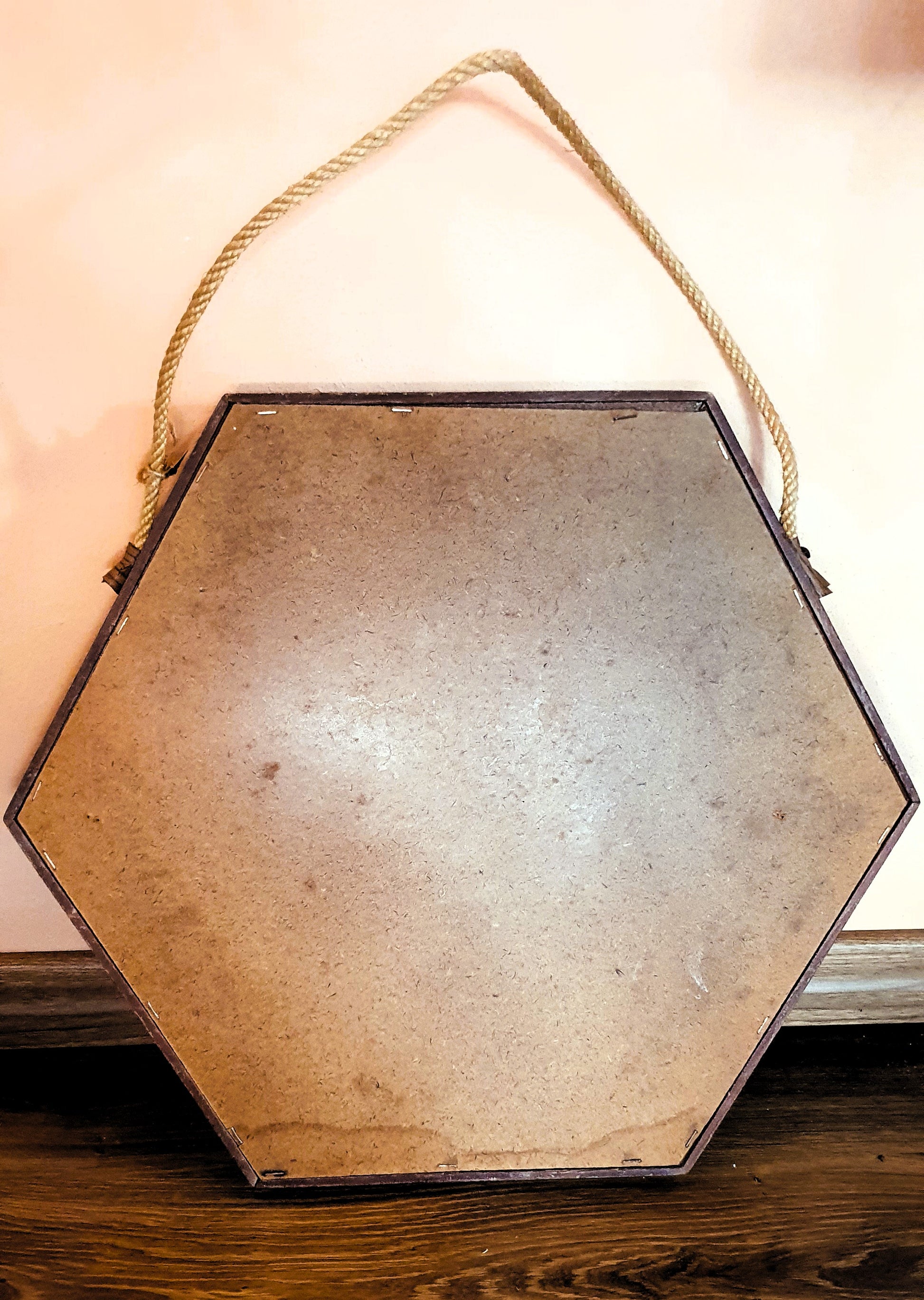 Specchio esagonale con cornice in legno di teak e cinghia in corda.