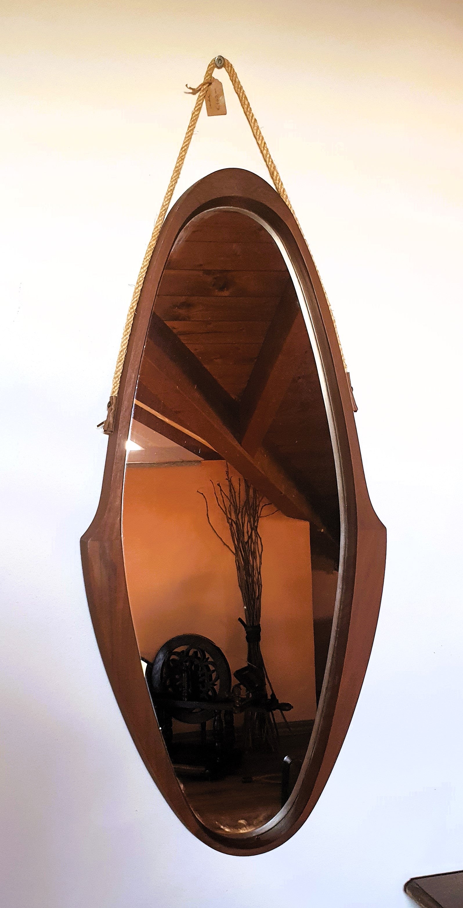 Specchio ovale con cornice sagomata in legno di teak e cinghia in corda.