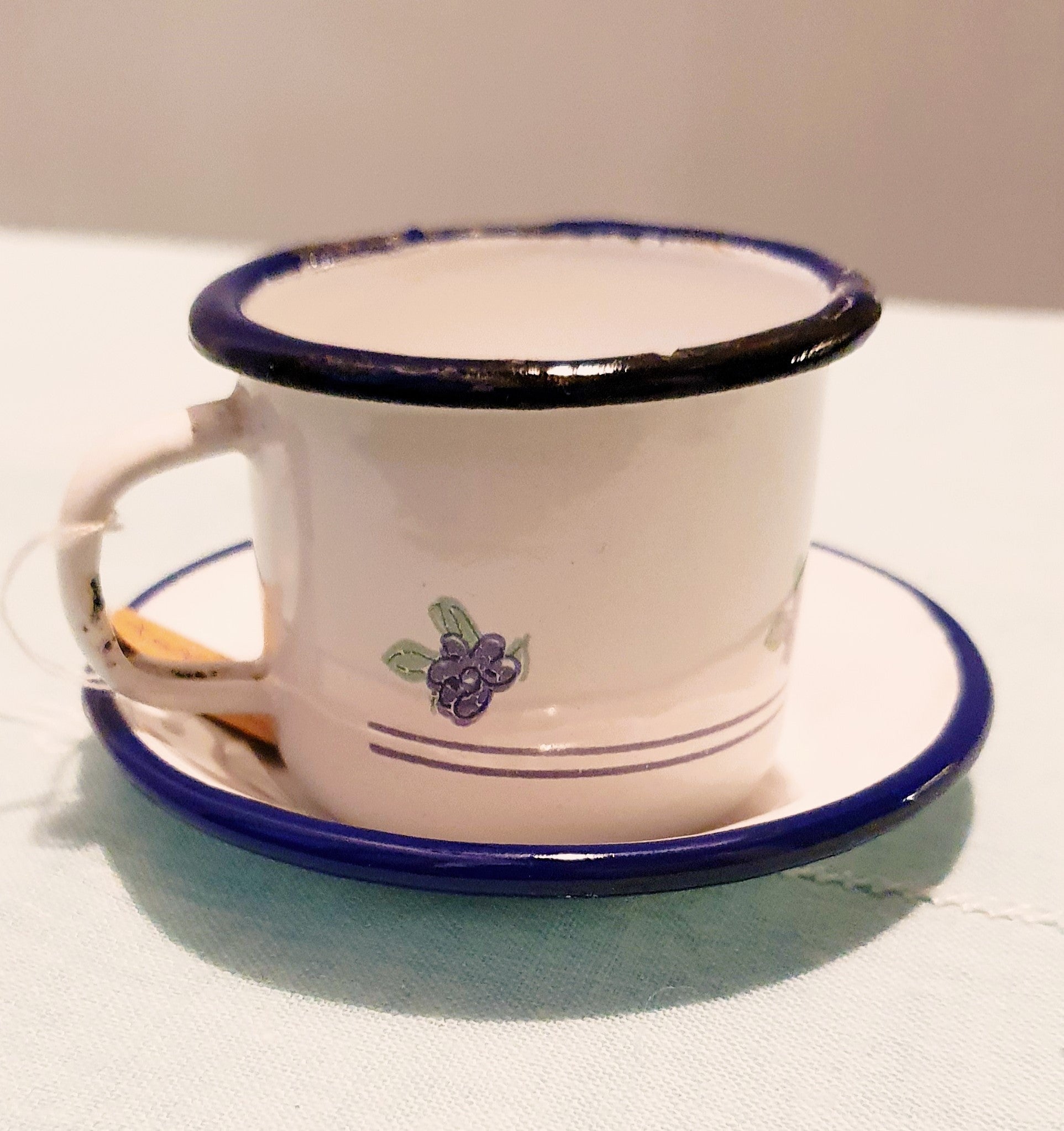 Tazzina e piattino vintage in latta smaltata.