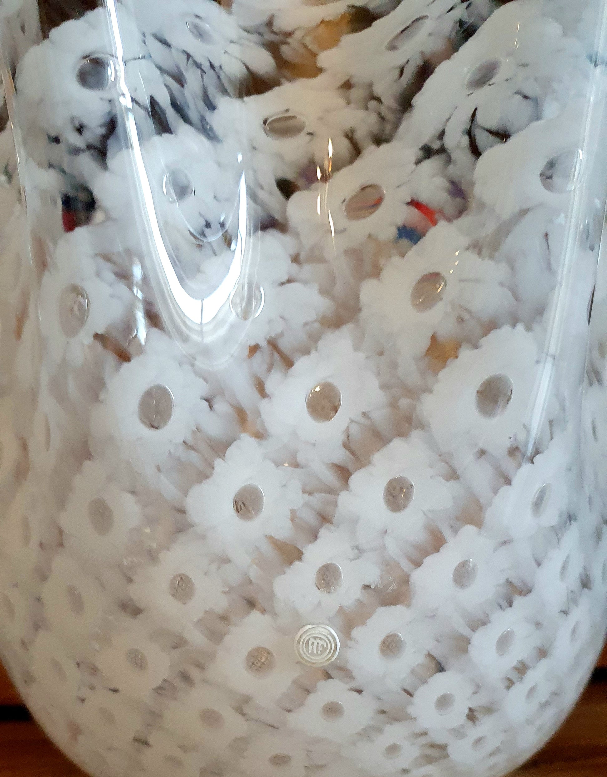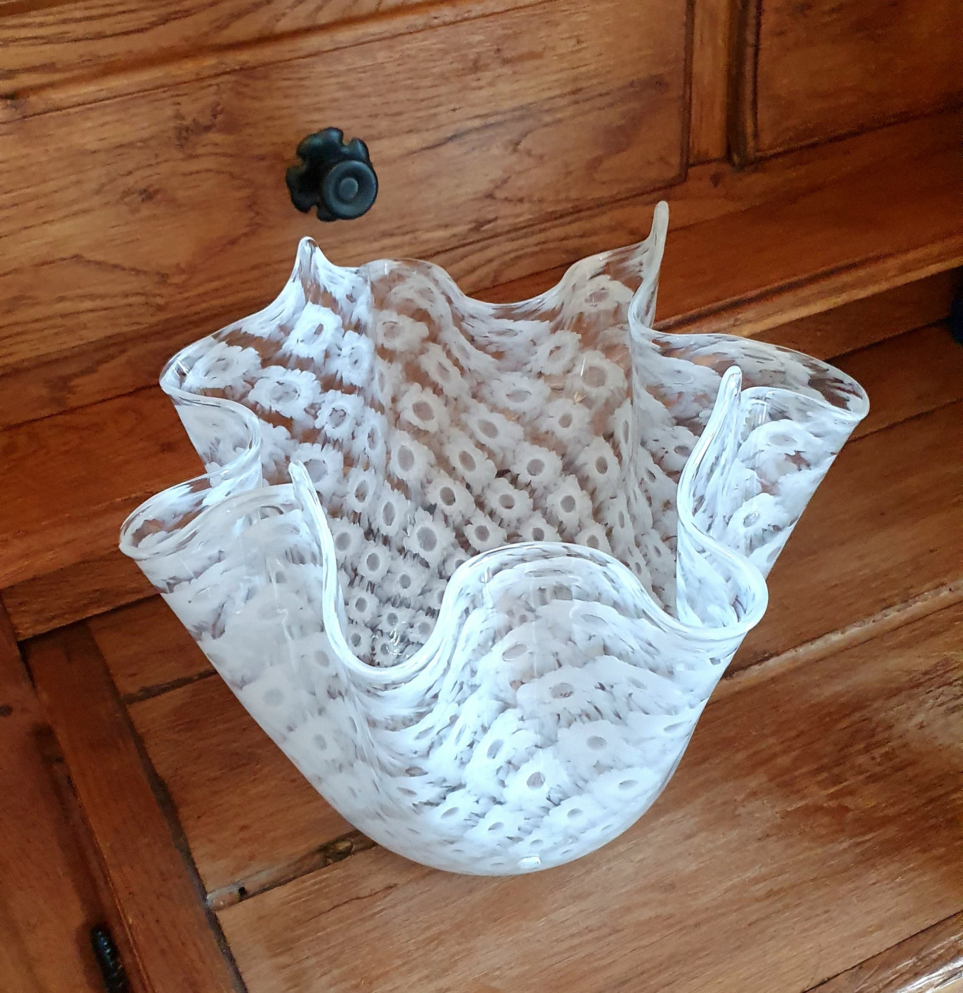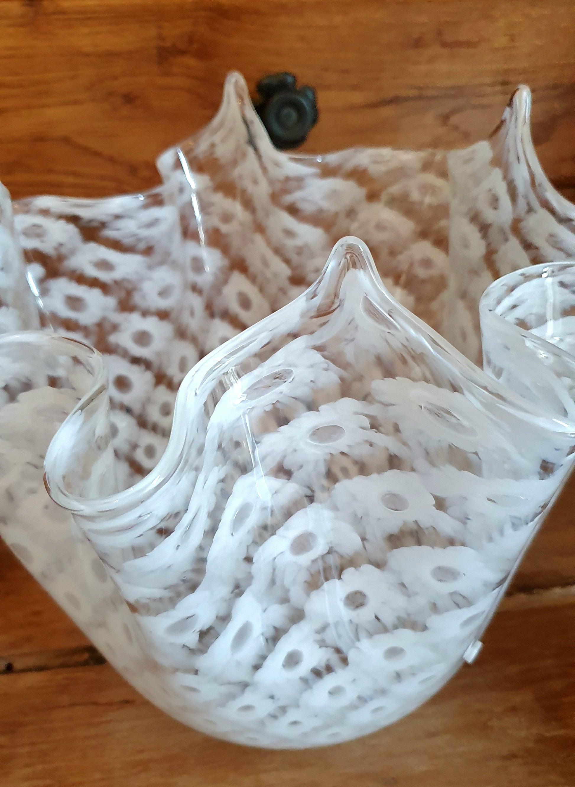 Vaso a fazzoletto, stile " macrame' " in vetro soffiato di Murano.